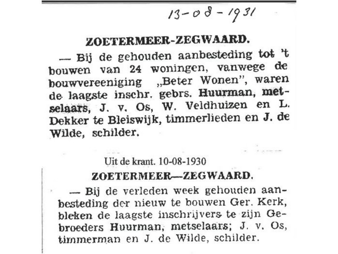 Oude krantenartikelen uit 1901, 1930 en 1931 met daarin de vacature voor metselaars en berichtgeving over aanbestedingen.